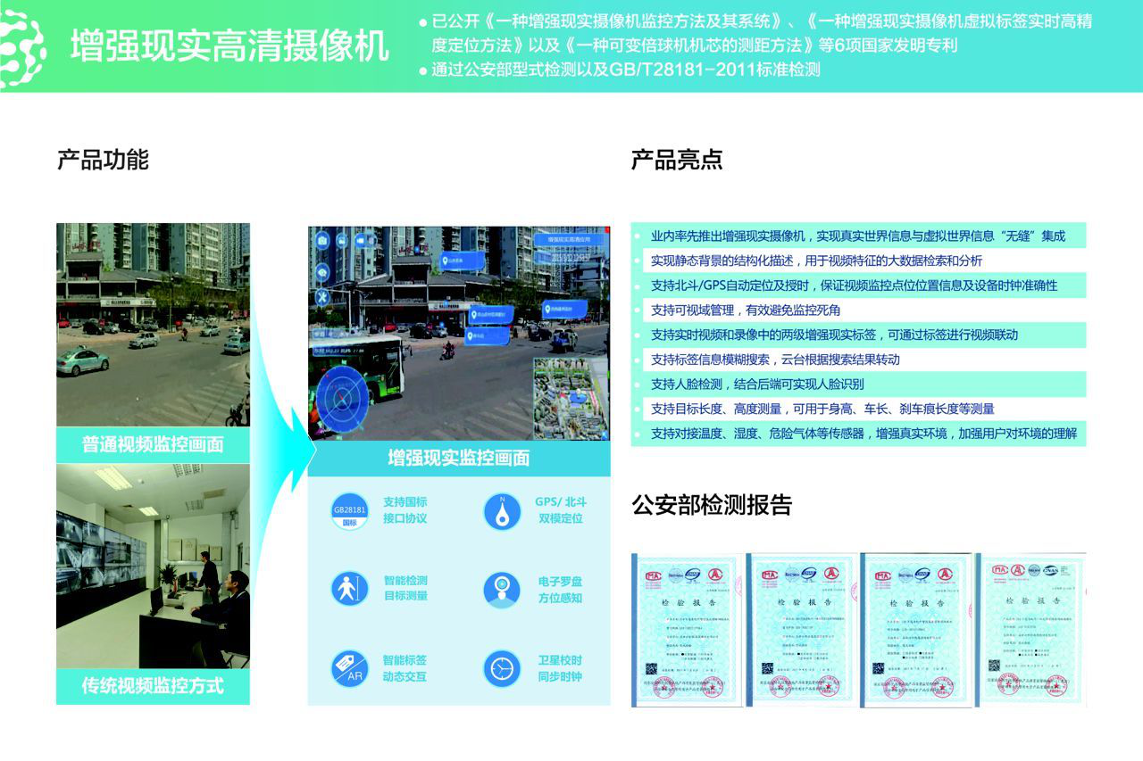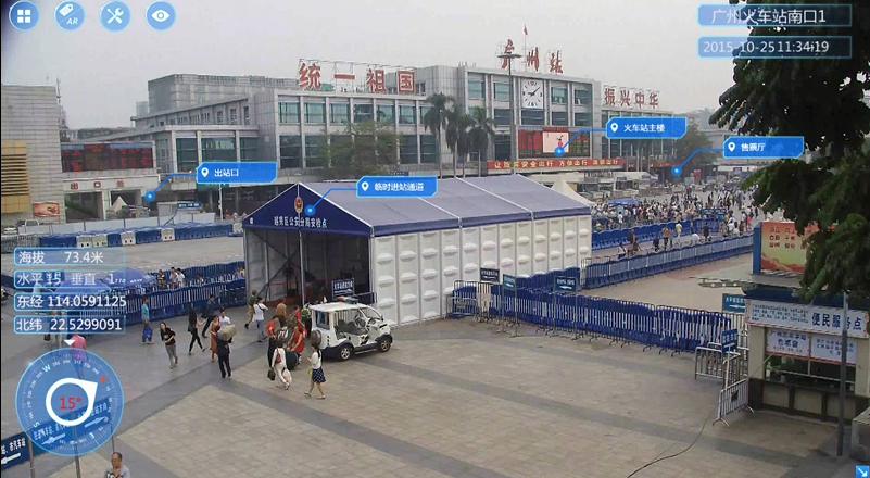 “增强现实”在摄像机领域是一个全新的概念,普通摄像机反映的是“现实”,这种现实由于缺少附加性的信息,给监控画面的安保人员带来了极大的困惑。为了解决这些问题,需要在“现实”的基础上进行“增强”,给实时监控画面添加名称、经纬度、方位角、距离、位置、历史案例描述、联系方式等等信息,这些辅助能屏幕前的安保人员及时有效地处理视频画面捕捉到的异常、突发情况。